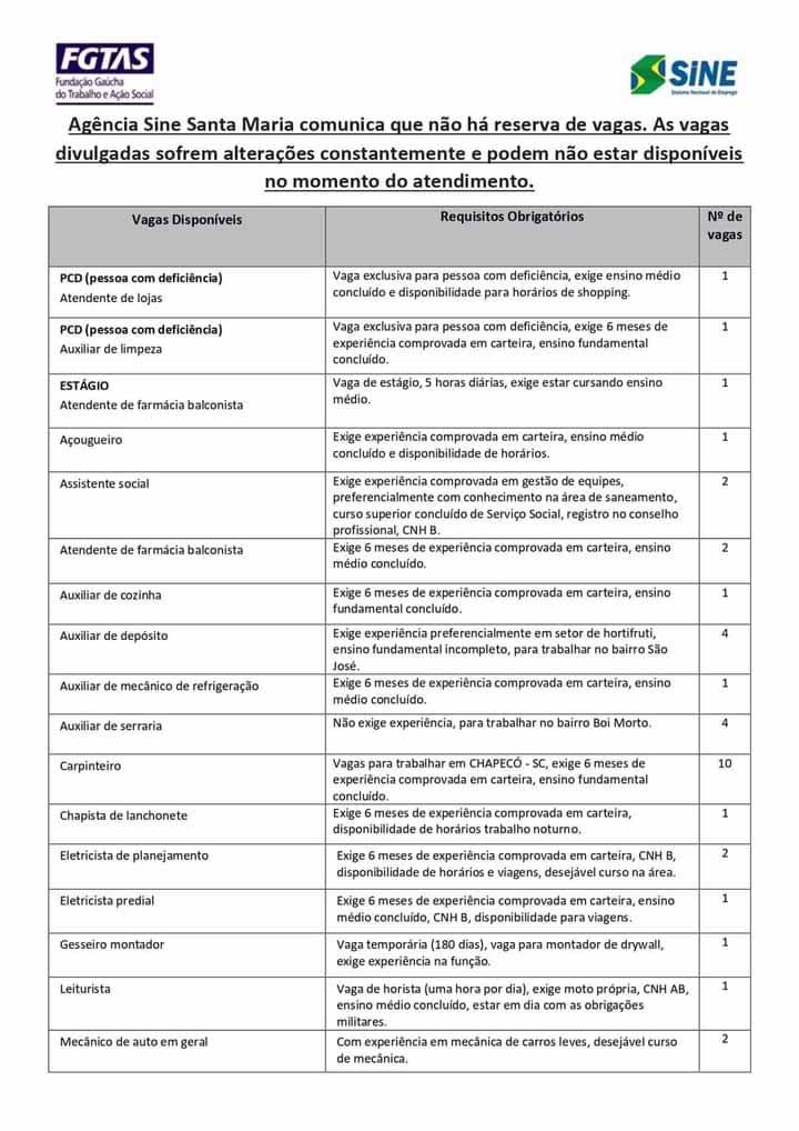 Confiras as vagas em Santa Maria.