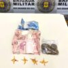 No momento da apreensão, o suspeito disse que achou o saco “na esquina” e que não era seu. Diante dos fatos foi dada voz de prisão a feito uso de algemas para salvaguardar integridade corporal da guarnição e autor.