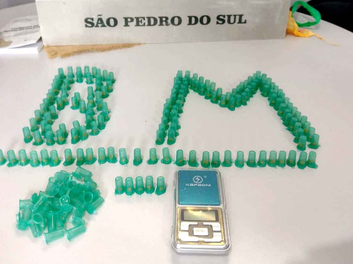 Diante da atitude suspeita, os policiais deram voz de abordagem ao indivíduo, e ao fazer a revista pessoal, foi localizado no saco que carregava 168 pinos de plástico contendo substância de cor amarela semelhante à crack, com peso total 124,16 gramas, 23 pinos de plástico vazios de cor verde e uma balança de precisão.