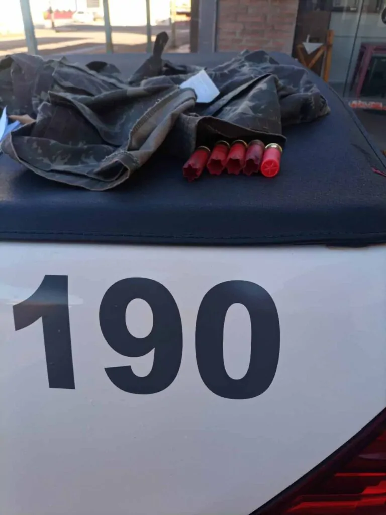 Com base nas informações e nos dados do veículo do suspeito, os policiais realizaram buscas e localizaram o automóvel na Rua Cel. Scherer. O homem foi abordado e, durante a revista pessoal e veicular, foram encontrados quatro cartuchos calibre 12 deflagrados no bolso do casaco, além de uma munição do mesmo calibre no interior do veículo. Arma não encontrada na abordagem.