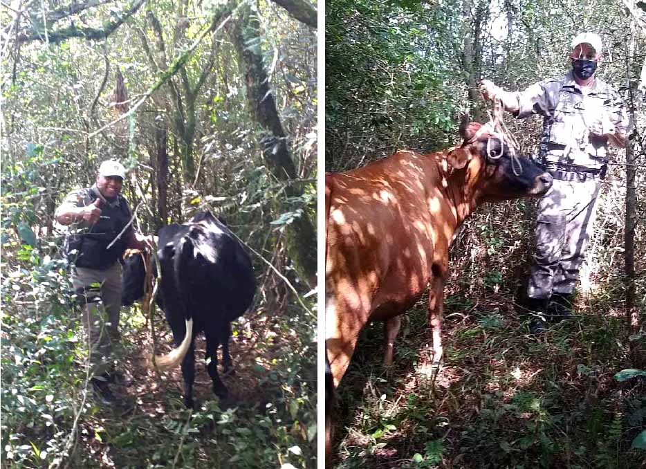 Momentos depois, o fone 190 da BM recebeu uma ligação anônima informando uma movimentação suspeita em um mato nas proximidades do bairro Gaúcha. De imediato os policiais foram ao local indicado e encontraram as duas vacas furtadas, momento em que avistaram dois homens escondidos nas proximidades, que saíram em fuga. Um dos ladrões chegou a ser reconhecido pela guarnição, mas devido a distância não foi possível realizar a abordagem.