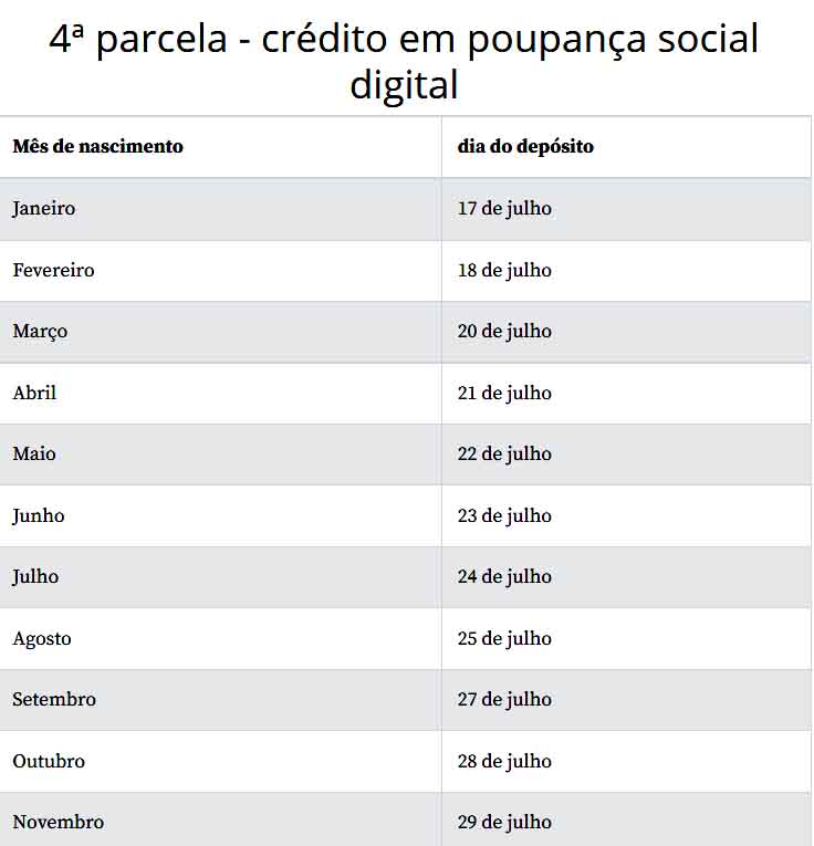 No último dia 15, a Caixa anunciou a antecipação do pagamento da quarta parcela. O calendário de depósitos, que começaria no próximo dia 23 e terminaria em 22 de agosto, teve o início antecipado para o último dia 17 e será concluído em 30 de julho.