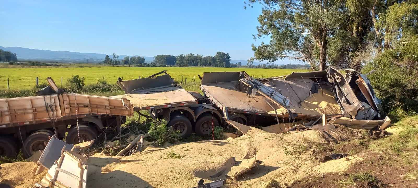 Por volta das 15h30 desta sexta-feira (19), o motorista de uma carreta carregada de farelo de soja trafegava pela BR 287, sentido São Pedro/ Santa Maria, quando perdeu o controle do veículo ao fazer uma ultrapassagem na localidade de Viaduto, a cerca de 10 Km do trevo de acesso a São Pedro, descendo o barranco e capotando. O motorista saiu da carreta aparentemente ileso do acidente. Ele foi levado ao PAM de São Pedro para atendimento médico pelo Resgate do Corpo de Bombeiros. Veja o vídeo.