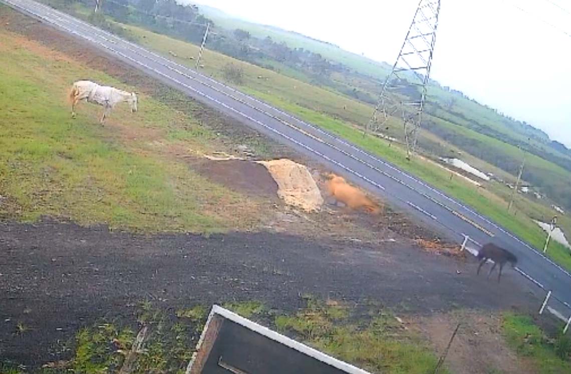Na manhã desta quarta-feira (21), câmeras de videomonitoramento de um morador nas proximidades, voltou a registrar a irresponsabilidade do proprietário ou proprietários destes animais. Três cavalos foram novamente flagrados soltos ao lado da rodovia. Até quando…