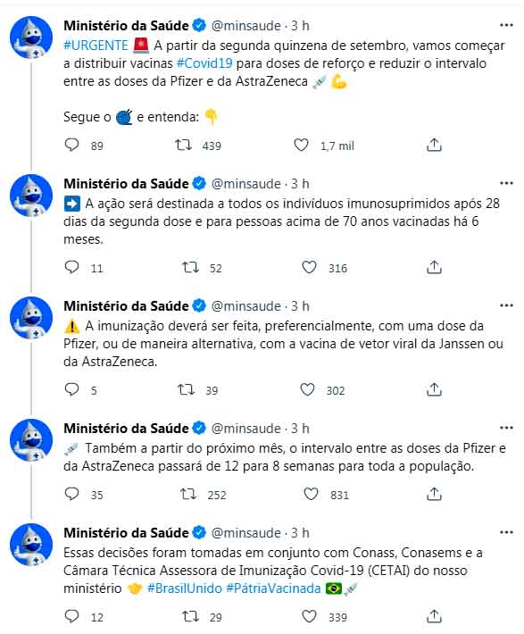 O Ministério da Saúde informa que iniciará, na segunda quinzena de setembro, a aplicação da dose de reforço da vacina contra a covid-19 a “todos os indivíduos imunossuprimidos após 28 dias da segunda dose e para as pessoas acima de 70 anos vacinados há 6 meses”.
