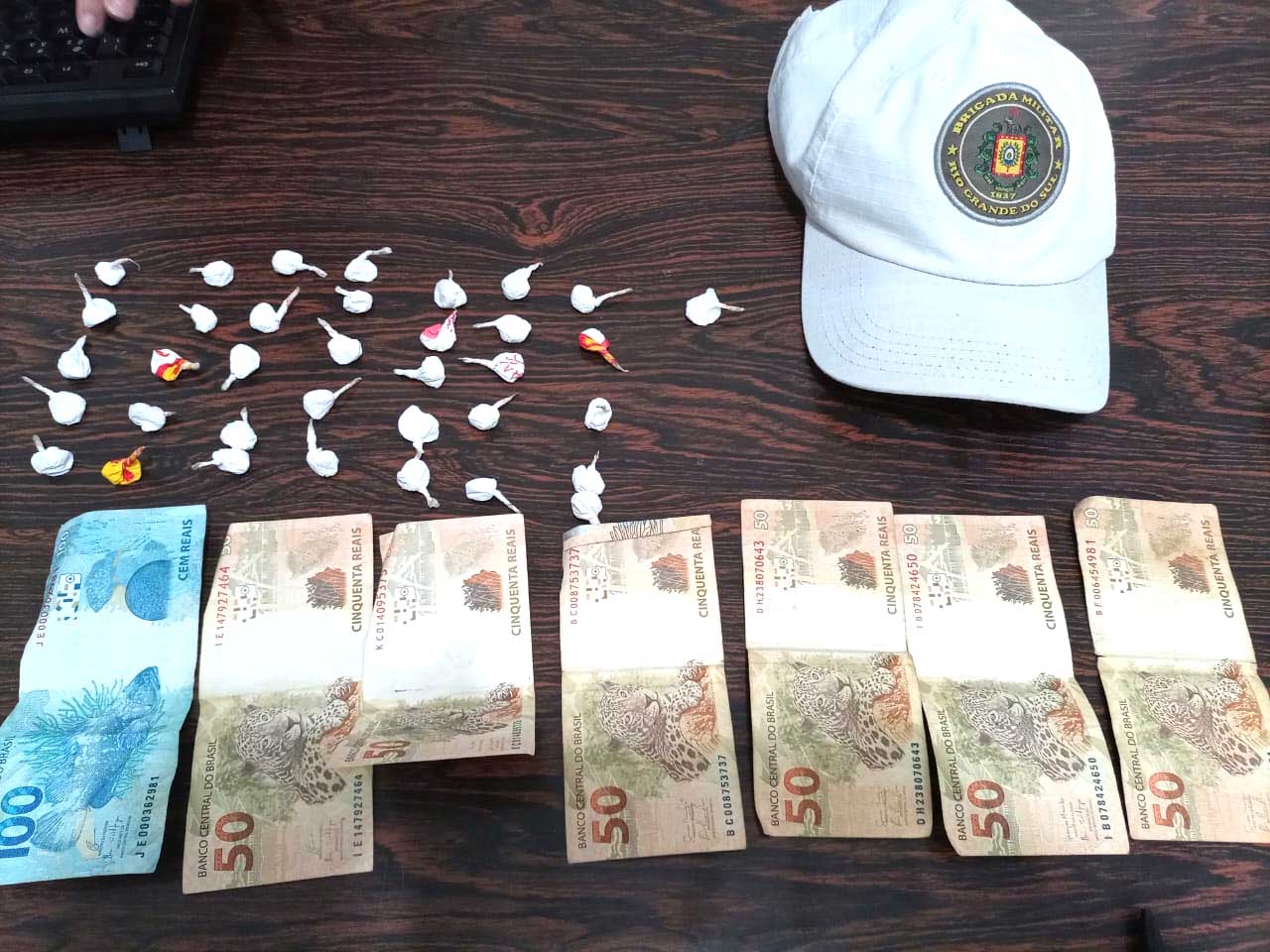 Durante a abordagem, os policiais encontraram com o criminoso várias porções de cocaína devidamente embaladas em porções para venda, além de R$400,00 em dinheiro.