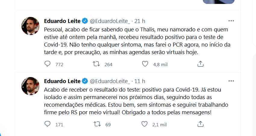 O governador gaúcho Eduardo Leite confirmou em postagem no Twitter no final da noite de ontem, terça-feira (11/1), ter testado positivo para a Covid-19, pela segunda vez em um ano e meio. Ele havia se submetido a exame RT-PCR e cancelado compromissos presenciais desde a tarde, quando soube que o seu namorado estava infectado pelo coronavírus.