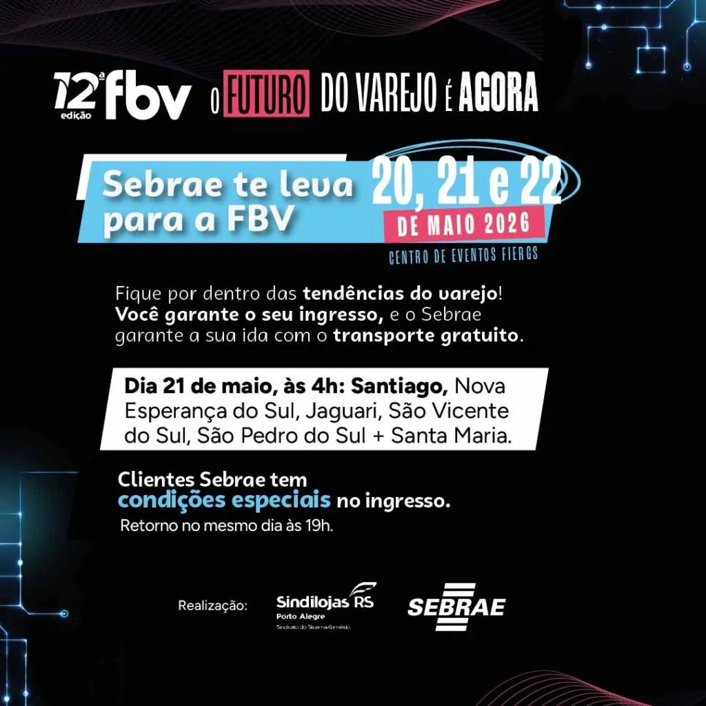 Os interessados em participar das missões empresariais podem entrar em contato pelo WhatsApp: wa.me/555599842063. As vagas são limitadas. Além disso, clientes Sebrae tem 50% de desconto nas inscrições para o evento: https://www.sympla.com.br/evento/fbv-feira-brasileira-do-varejo-2026/3228595?d=SEBRAERS50OFF