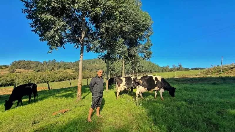 Eucaliptos foram implantados na propriedade, em pontos estratégicos, para gerar sombra nas áreas em que o gado leiteiro pasteja. O produtor conta que o plantio de árvores resultará em ganhos econômicos mais à frente, mas uma das grandes contribuições que ele já diz notar é a melhoria da sanidade do rebanho. “Na minha propriedade tinham poucas árvores e as vacas acabavam deitando em um único espaço de sombra que existia. Se uma vaca estava doente, transmitia para as outras. Agora, tem mais sombra na área de pastagem e elas se espalham. Aumentou o bem-estar e diminuiu a incidência de mastite”, relata. Com mais conforto térmico, as vacas também consomem mais pasto e, consequentemente, tem mais condições de ampliar a produção.