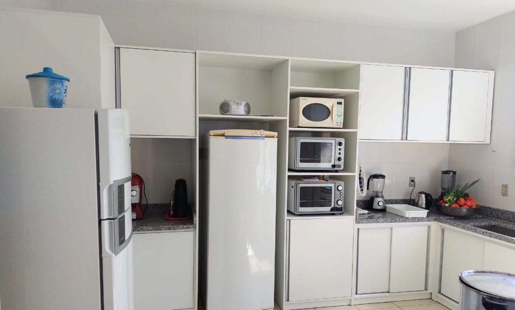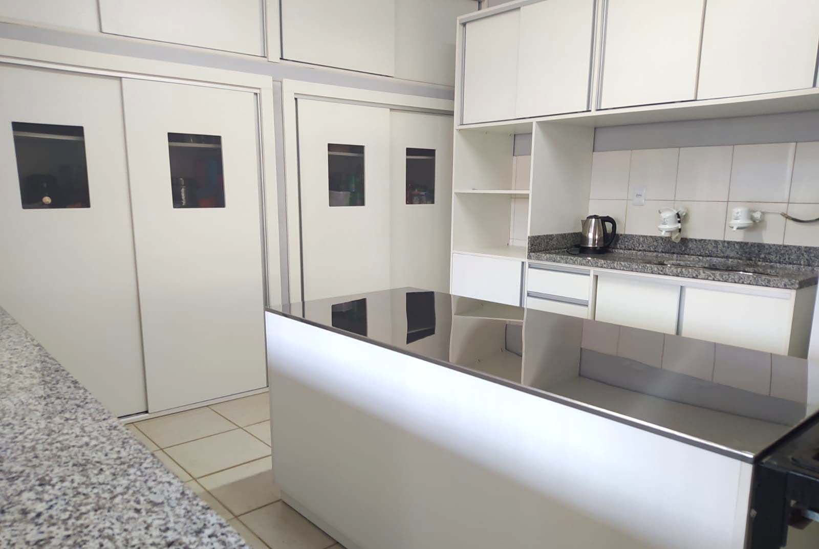Os móveis, que foram desenhados pelo arquiteto Reges Beltrame, são compostos com bancadas em granito e inox, cubas inox, torneiras gourmet, com móveis organizados para melhor atender o distribuição da merenda escolar.