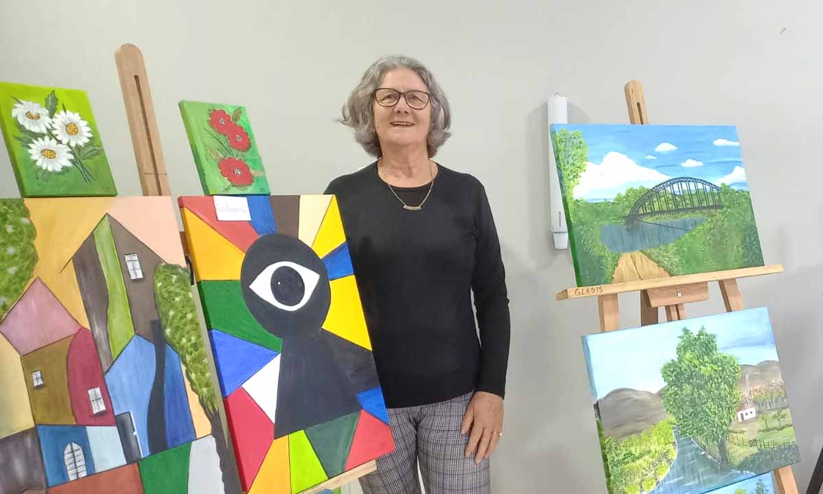 A artista plástica Vera Lucia Schmitt está expondo 24 quadros, pintados na técnica acrílico sobre tela, no hall da entrada da Associação Comercial e Industrial de São Pedro do Sul. As obras retratam paisagens e figuras abstratas.