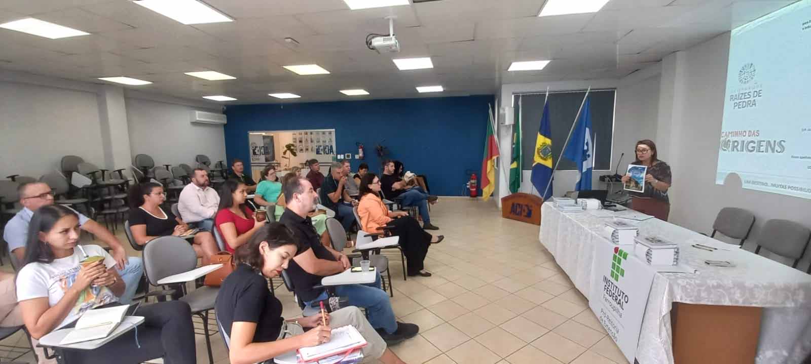 O encontro acontece no salão de eventos da Associação Comercial e Industrial (ACI) e conta também com a participação de representantes do Instituto Federal Farroupilha (IFF) e das coordenadoras do projeto Geoparque de cada município.