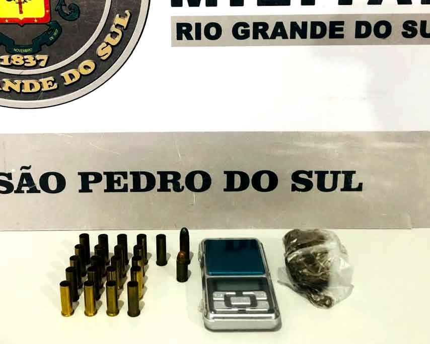 Ação realizada em via pública, na Rua Cel. Scherer, região central da cidade, os policiais apreenderam uma munição de Cal .40, uma munição Cal .38, 21 estojos de munição Cal .38 deflagrados, uma pequena porção porção de maconha e uma balança de precisão.