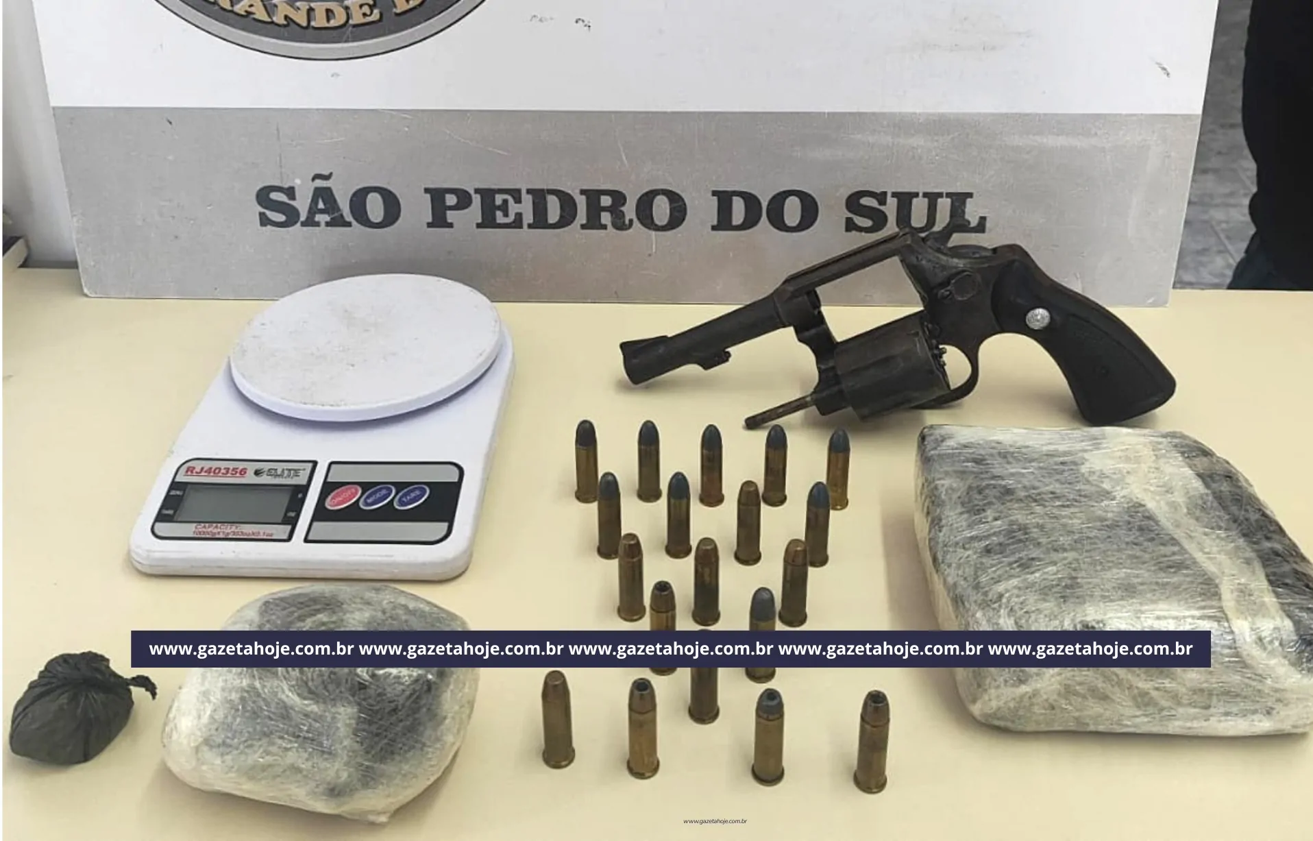 Durante a revista, foram apreendidos um revólver calibre .38, 19 munições do mesmo calibre, 72 gramas de crack, 357 gramas de maconha, 75 gramas de cocaína e uma balança de precisão.
