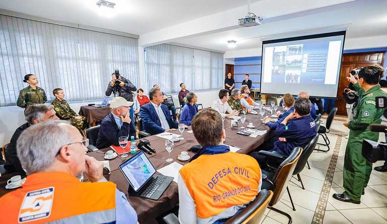 No encontro, o governador Eduardo Leite apresentou um panorama dos efeitos do evento meteorológico e das ações de resgate em andamento - Foto: Maurício Tonetto/Secom