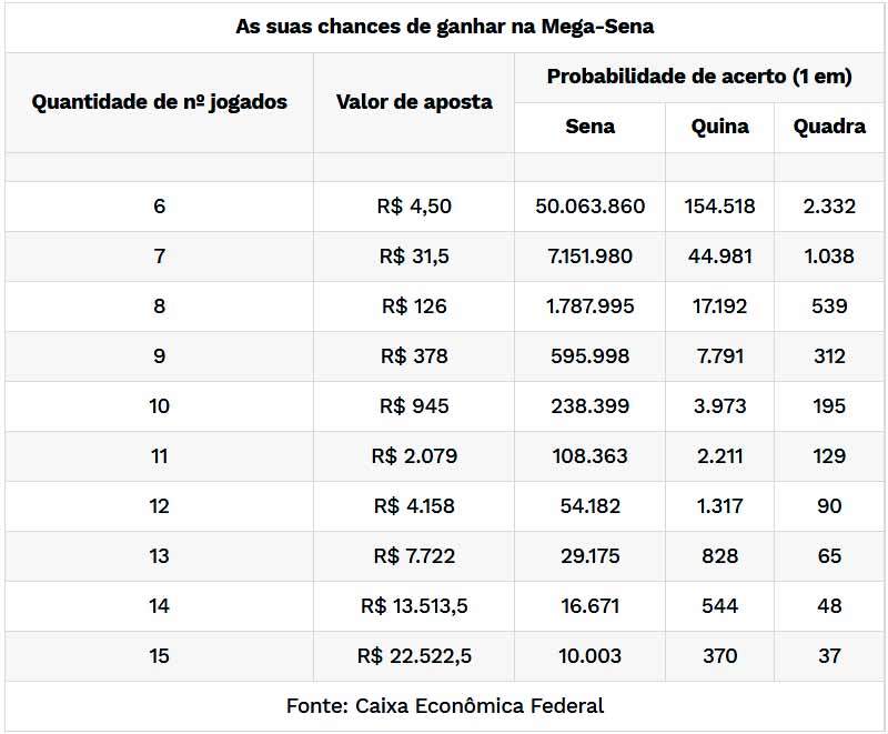 As apostas podem ser feitas até as 19h (horário de Brasília), em qualquer lotérica do país ou pela internet, no site da Caixa Econômica Federal – acessível por celular, computador ou outros dispositivos. É necessário fazer um cadastro, ser maior de idade (18 anos ou mais) e preencher o número do cartão de crédito. A aposta mínima custa R$ 4,50. Veja abaixo os valores das apostas e as probabilidades de ganhar.