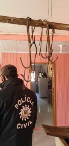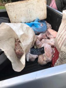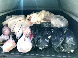 Foram apreendidos durante os cumprimentos dos mandados de busca e apreensão em torno de 300 (trezentos) quilos de carne bovina, ovina e suína sem procedência; uma arma de pressão; insumos para recarga de munição; 77 (setenta e sete) estojos de munição de vários calibres; uma garrucha, calibre .22; ganchos de açougue; pelegos; 17 (dezessete) cartuchos de munição de calibre .28; 41 (quarenta e uma) munições de calibre 9 mm, entre outros objetos.