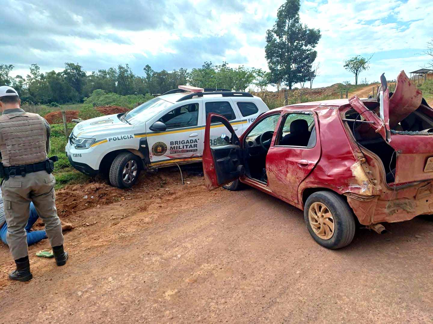 O policial militar tentou desviar para o lado, em direção ao barranco, mas o motorista do Celta acelerou para atingir a viatura da BM, colidindo na lateral esquerda. Em razão da batida, o eixo da roda da viatura policial ficou danificado, inviabilizando a utilização.