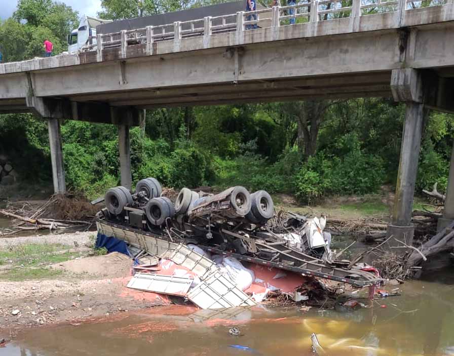No final da manhã desta terça-feira (23), um caminhão transportando cloreto de potássio colidiu contra a mureta de proteção da ponte sobre o Arroio Irapuãzinho e acabou caindo e capotando sobre o leito do arroio, localizado Km 305 da BR 153 em Caçapava do Sul.