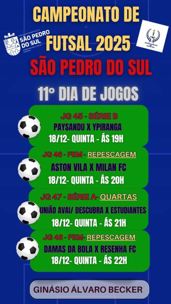 O Ginásio Municipal de Esportes de São Pedro do Sul recebe na rodada desta quinta-feira (19) jogos decisivos do Campeonato Municipal de Futsal, com confrontos decisivos nas categorias Feminino, Série A e Série B.