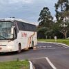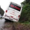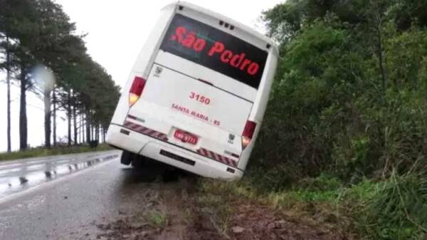 O ônibus da empresa Expresso São Pedro que faz a linha das 16h30 com saída de Santa Maria a Cacequi caiu fora da pista nesta tarde na BR 287, na localidade de Passo da Cruz, interior de São Pedro do Sul.