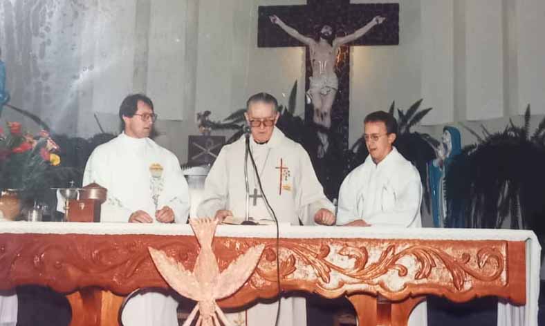Padre Bertilo e o Padre Mario Garlet na Igreja Matriz ao lado do Bispo Ivo Lorscheiter . Foto: Arquivo Comunidade Católica de São Pedro do Sul.