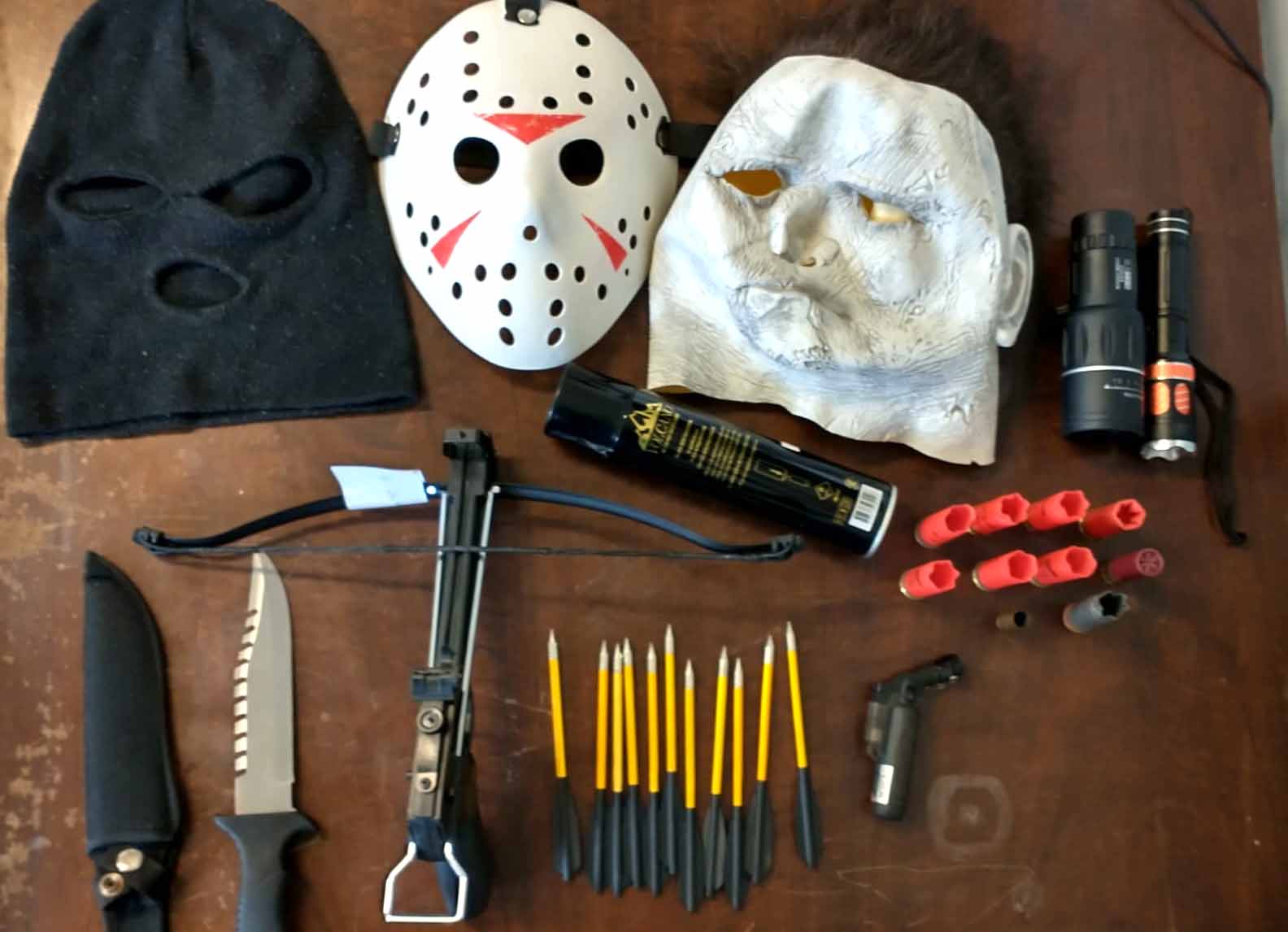 Um mandado de buscas foi expedido pelo Poder Judiciário local para uma vistoria no imóvel onde ele residia. No local os policiais encontraram armas brancas, uma besta com flechas metálicas, cartuchos de munição, máscaras, material explosivo (fluido de isqueiro) e um monóculo para observação.
