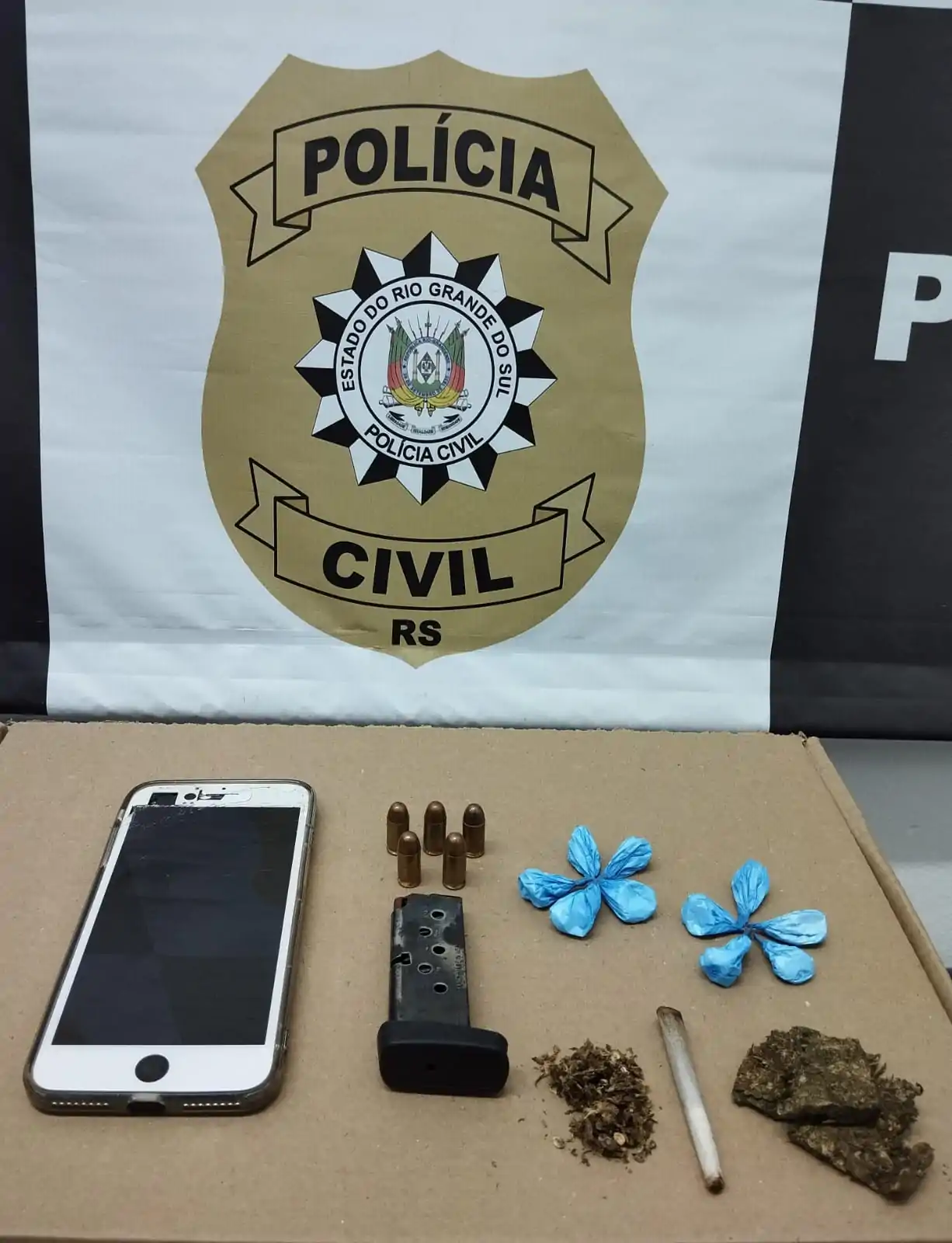 A Polícia Civil prendeu em flagrante, na tarde desta terça-feira, 19/08, um homem de 24 anos por tráfico de drogas e posse irregular de munições, no Bairro Centro, em São Pedro do Sul.