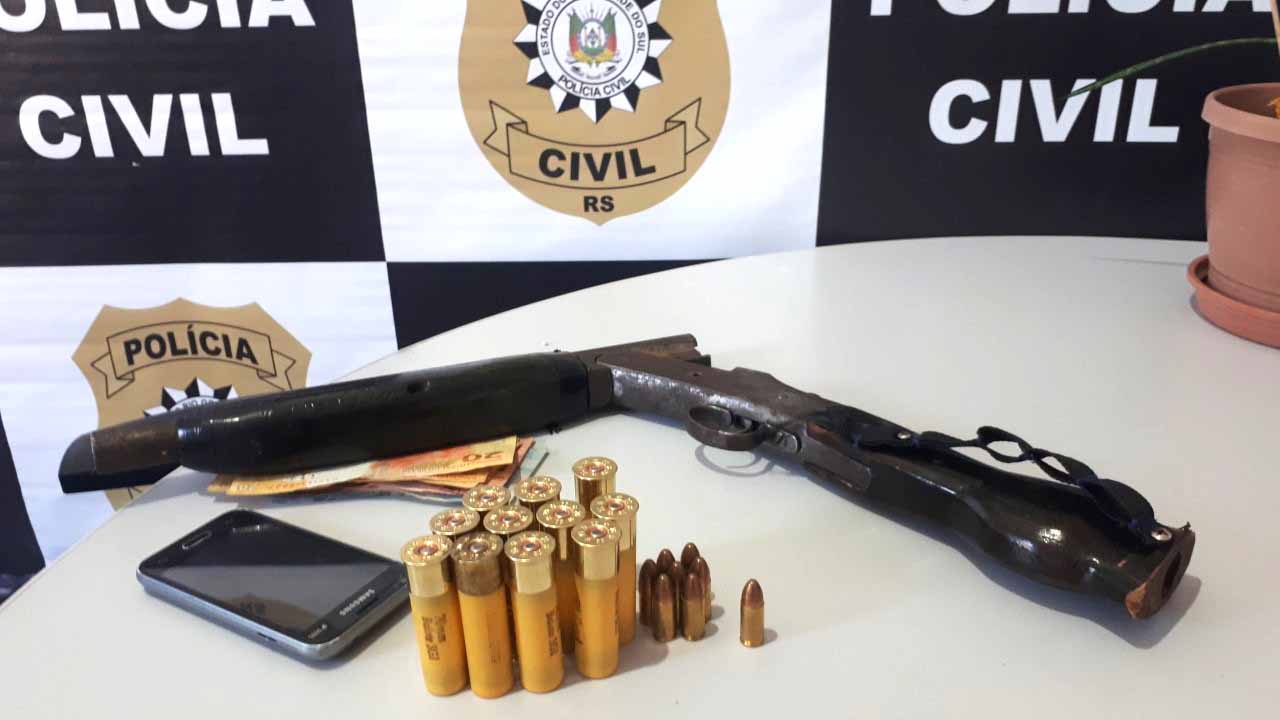 No local, com a ajuda de cães farejadores do 2º Batalhão de Operações Especiais de Santa Maria, os policiais encontraram uma espingarda com munição Cal. 20 com cano serrado e munição 9mm de uso restrito. Após buscas na casa e no terreno não foram encontradas drogas.