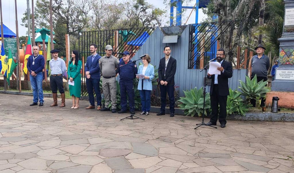 O tema local das comemorações deste ano é “São Pedro do Sul, Terra de Histórias Rumo ao Centenário”, convidando a população a refletir sobre o passado do município, as trajetórias que construíram a comunidade e o legado cultural, social e humano que deve ser preservado, além de projetar o futuro. Além do prefeito, participaram da solenidade, o presidente do Poder Legislativo, ver. Eduardo Serdotti, a juíza da Comarca, Walkyria Cabral, o vice prefeito Bruno Pinheiro, o delegado Giovanni Lovato, ten. Marcio Dias, comandante do 3º Pelotão da Brigada Militar. o 1º ten. Elton Flores de Campos, representando o Corpo de Bombeiros, vereadores, secretários municipais, além de representantes de entidades locais, cooperativas, diretores de escolas, professores, estudantes, grupo de escoteiros Selva de Pedra e Projeto ADAD.