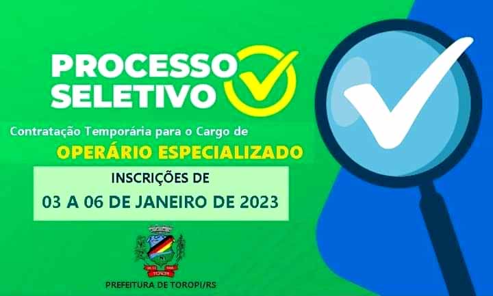 O MUNICÍPIO DE TOROPI TORNA PÚBLICO que realizará PROCESSO SELETIVO SIMPLIFICADO PARA CONTRATAÇÃO TEMPORÁRIA, para a função de OPERÁRIO ESPECIALIZADO. Inscrições de 03 de janeiro de 2023 a 06 de janeiro de 2023. As inscrições presenciais serão realizadas no Centro Administrativo Municipal, sito a Rua Fernando Ferrari, 235, na Secretaria de Administração, em dias úteis, no horário das 08 às 12 horas e das 13 horas às 16 horas, ou via internet pelo site www.toropi.rs.gov.br, no link https://toropi.rs.gov.br/transparencia/processos-seletivos/detalhes/29/2023. Maiores informações e Edital na íntegra poderão ser obtidos no Quadro de Publicações Oficiais da Prefeitura e no site www.toropi.rs.gov.br, a partir da data de publicação do edital. Toropi, 02 de janeiro de 2023 – LAURO SCHERER – Prefeito Municipal