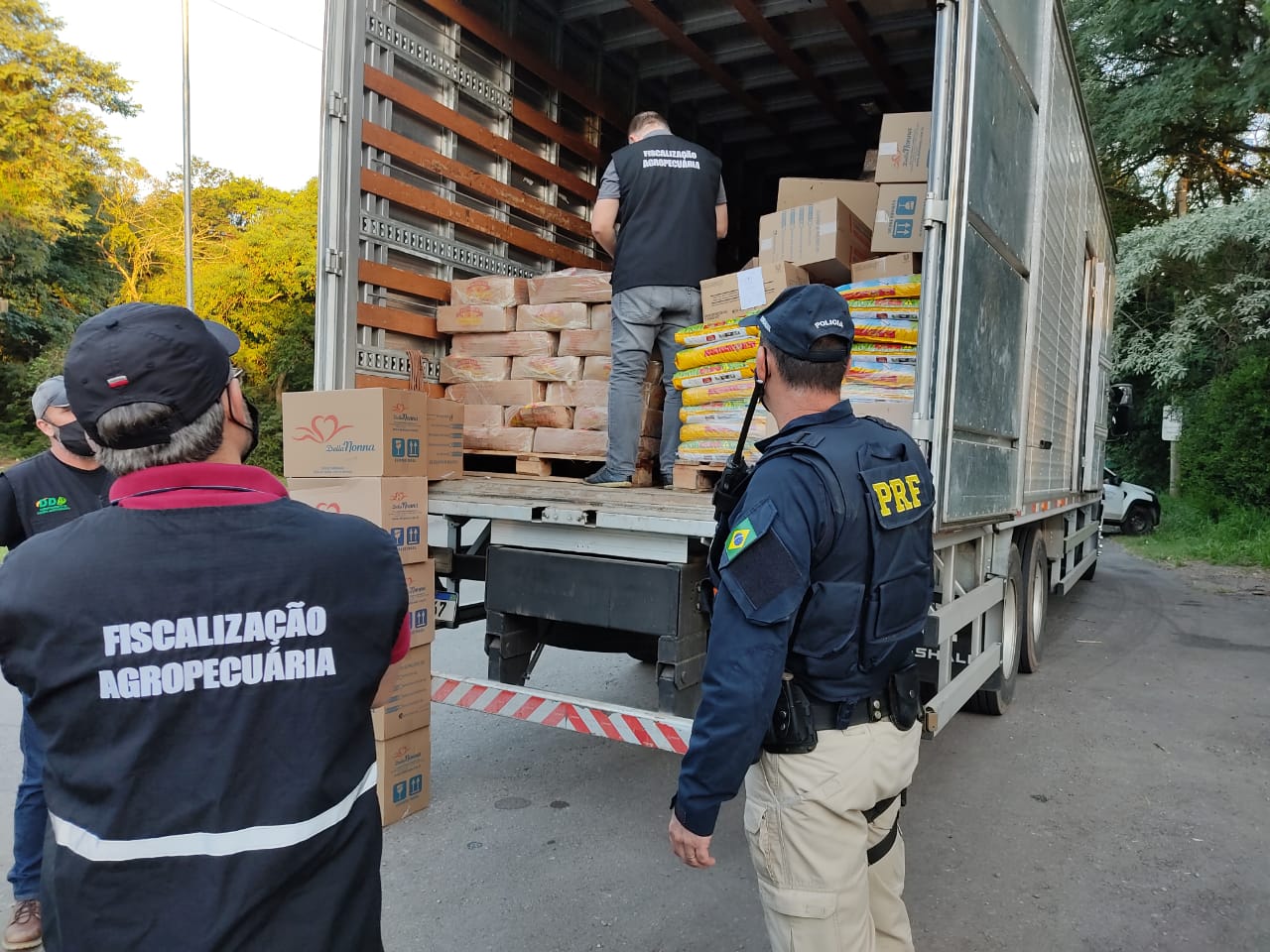 Policiais Rodoviários Federais realizavam fiscalização na BR 392 quando abordaram um caminhão Ford Cargo emplacado em Restinga Seca. Ao vistoriarem o compartimento de carga, encontraram mais de 2.300 kg de carne de frango e presunto que estavam sem nenhuma refrigeração. Com eles ainda havia produtos de limpeza e inseticidas.