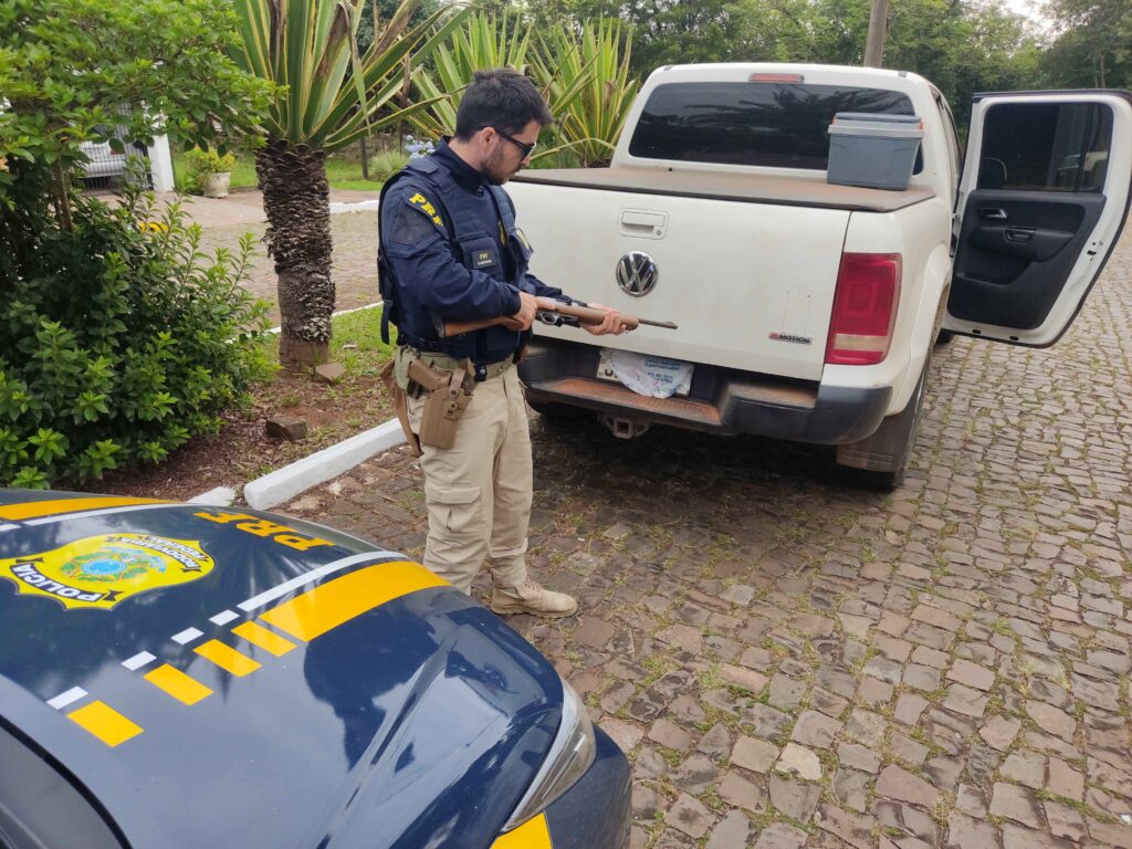 Durante atividade de policiamento, os PRFs flagraram o motorista de uma Amarok ultrapassando em local proibido. Ao abordarem a caminhonete, os policiais encontraram um rifle calibre .22 no assoalho traseiro.