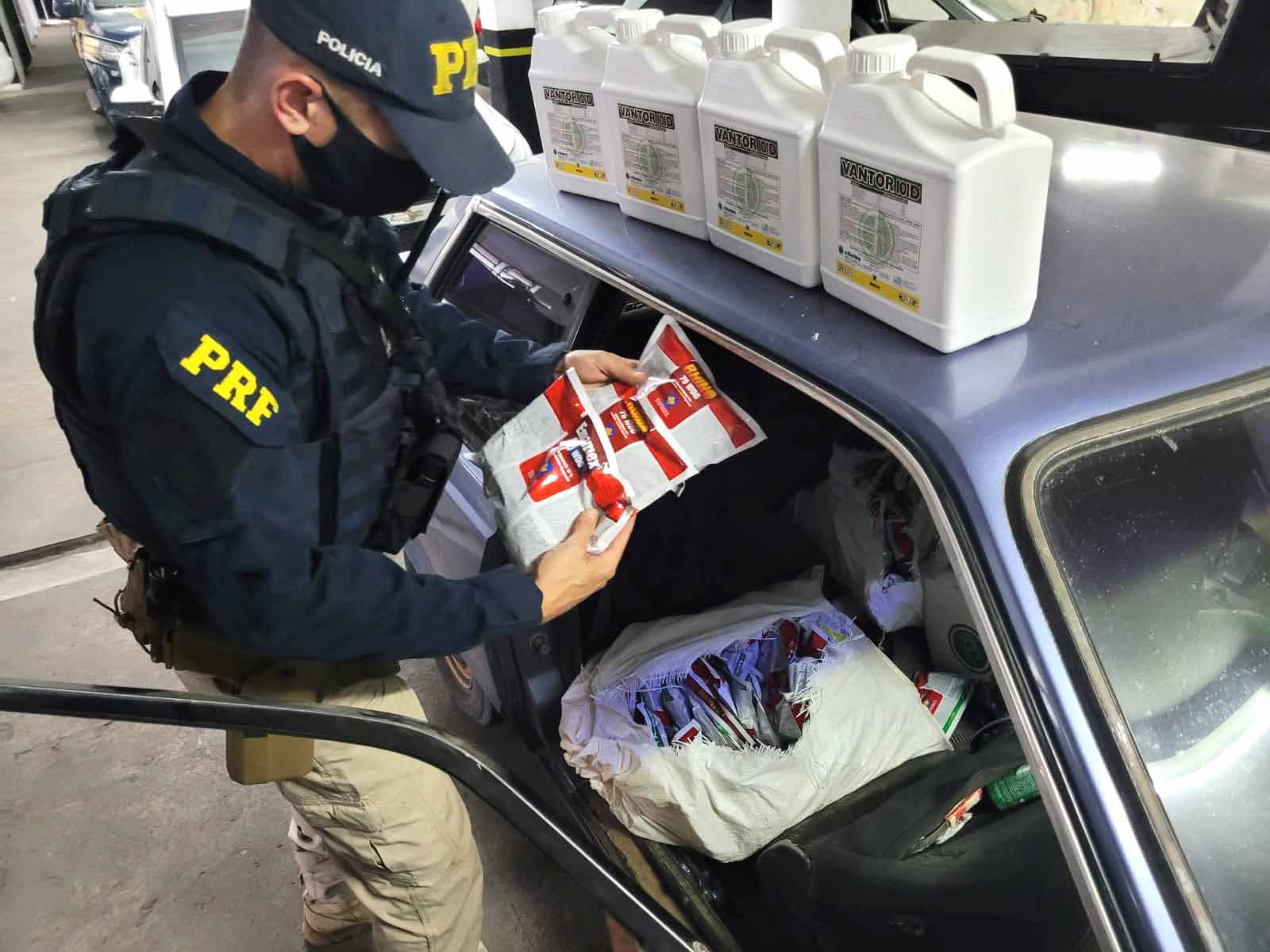 No interior do Del Rey, dirigido por um homem de 49 anos, foram encontradas 117 embalagens de agrotóxicos contrabandeados, de fabricação estrangeira, totalizando a quantidade de 25 litros e 39 quilos.