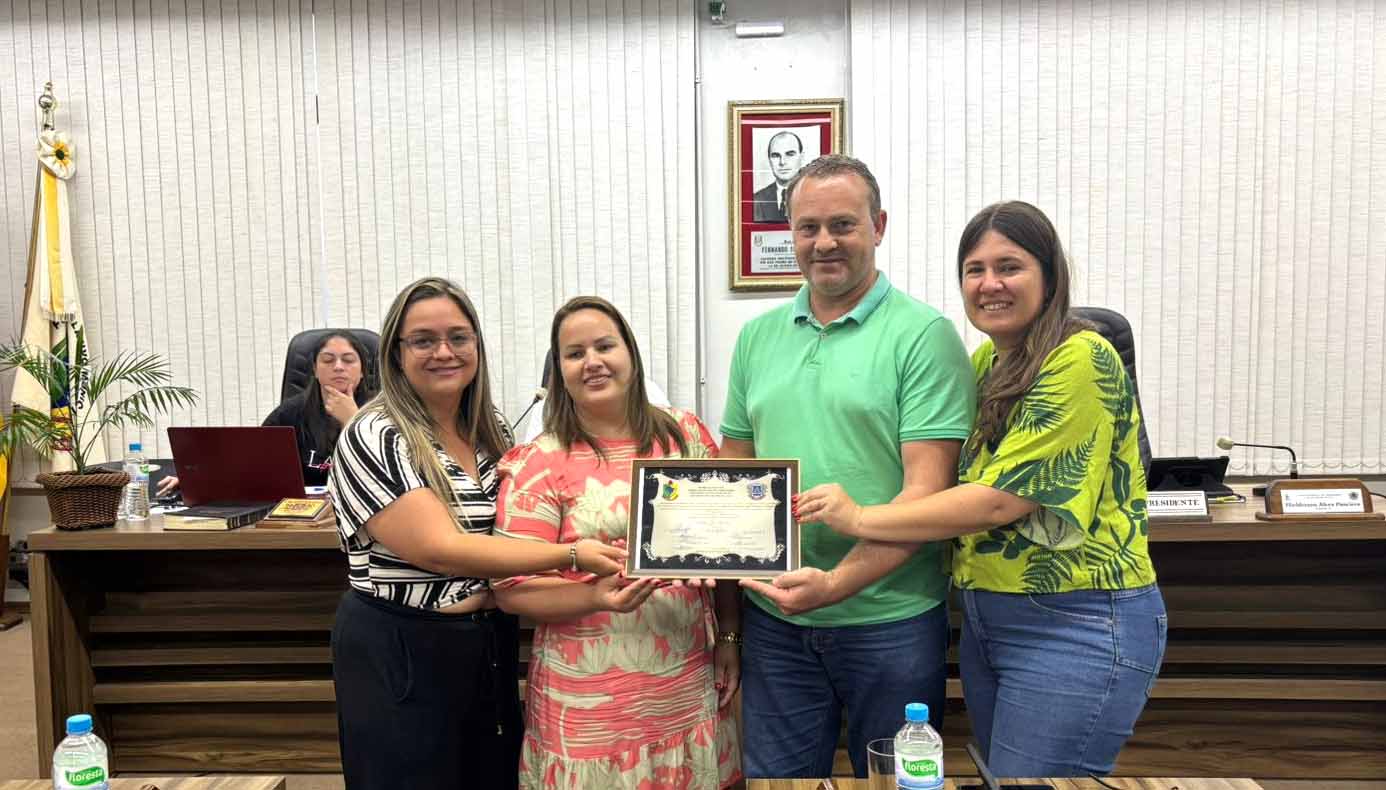 A Moção de Congratulações pela conquista do Selo Ouro foi de autoria do ver. Kiko Panciera (PP), que fez a entrega da homenagem a secretária de Saúde, Raquel Mendonça, a Enfermeira e Coordenadora do Setor de Imunização, Sabrina Garcia, e a Enfermeira Responsável Técnica dos ESF, Jéssica Paz.