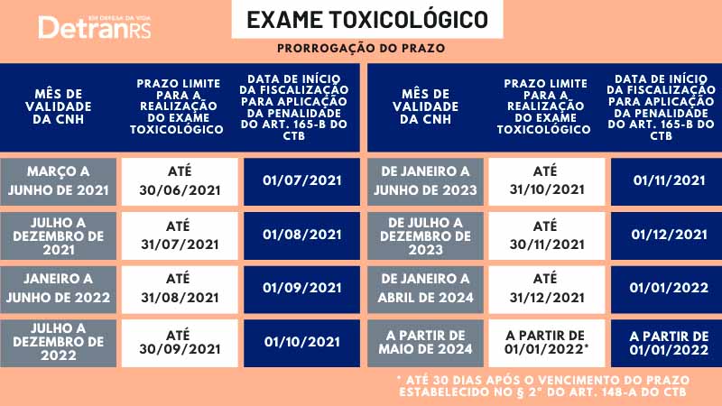 A novidade trazida pelo Denatran neste ano foi, além da prorrogação dos prazos, a mudança na fiscalização, passando a ser contada a data da realização do exame e não mais a do registro do resultado. Dessa forma, o condutor não é penalizado em caso de atraso por parte do laboratório. Os laboratórios credenciados têm até 24 horas para informar a data e hora da coleta e, até o final de 2021, os resultados deverão ser registrados em até 25 dias. A partir de 2022, essa informação volta a ser cadastrada em até no máximo 15 dias. Resultado positivo no exame toxicológico acarretará a suspensão do direito de dirigir por três meses.