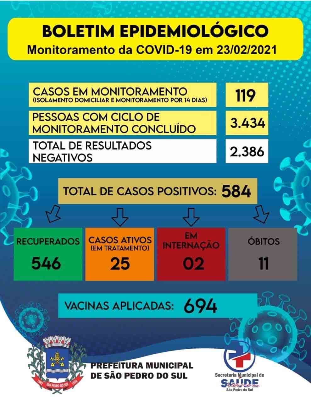 Ainda de acordo com o boletim, de ontem para hoje o número de casos ativos no município passou de 23 para 25 e as internações em hospitais de uma para duas.