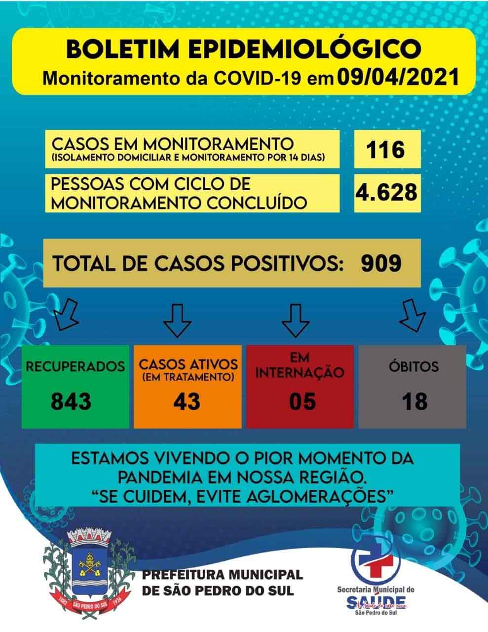Neste mês de abril foram notificados pela SMS 61 novos casos na cidade em nove dias e o total de óbitos desde 20 de agosto é de 18. Ainda de acordo com o boletim, 843 moradores estão recuperados da doença e existem 43 casos ativos com cinco internações em hospitais.