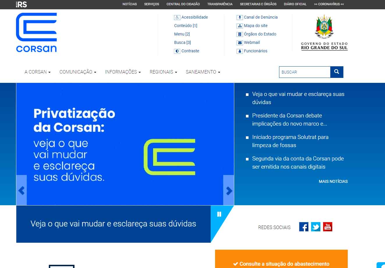 Hoje, os canais digitais são os mais procurados, representando mais de 86% do total das demandas registradas. O nível de digitalização dos serviços da Corsan está em 88%, tornando a Companhia referência entre os demais órgãos do governo do Estado. A Central de Serviços, no site, canal que registra o maior número de solicitações e tem sido um diferencial no atendimento ao cliente desde o início da pandemia, oferecendo diversos serviços. Nesse canal, o cliente pode registrar a sua solicitação, 24 horas por dia, sem necessidade de atendimento telefônico ou presencial, para os principais serviços.