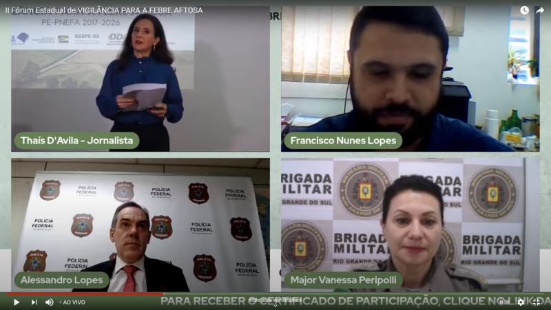 O reconhecimento do Rio Grande do Sul como zona livre de febre aftosa sem vacinação pela Organização Mundial de Saúde Animal (OIE) em maio consolidou uma nova forma de vigilância e fiscalização agropecuária no Estado, com ênfase nas ações coordenadas de segurança em regiões transfronteiriças e na responsabilidade compartilhada entre setores público e privado para a manutenção do novo status sanitário. Estes aspectos foram tratados no 2º Fórum Estadual de Vigilância para a Febre Aftosa, realizado de forma virtual na quinta-feira (10/6).