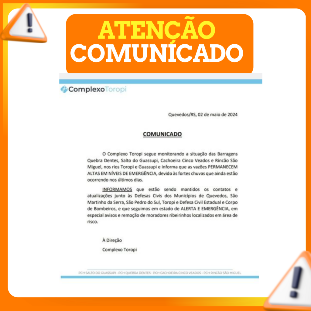 O Complexo Toropi informa a situação das barragens Quebra Dentes, Salto do Guassupi, Cachoeira Cinco Veados e Rincão São Miguel nos rios Toropi e Guassupi