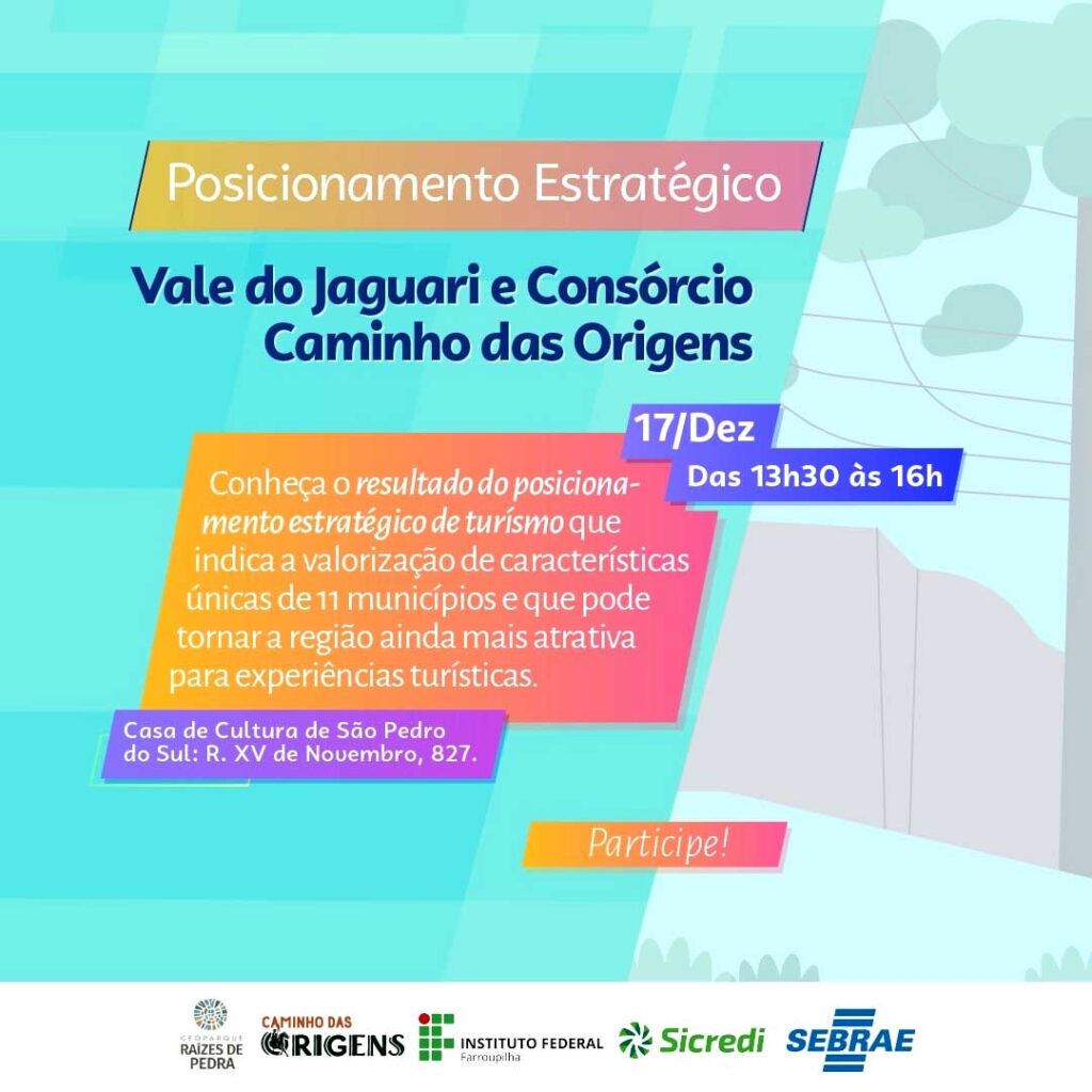 Na terça-feira, 17 de dezembro, ocorrerá em São Pedro do Sul a entrega do relatório final do posicionamento estratégico para o turismo da região do Consórcio Caminho das Origens, Vale do Jaguari e Geoparque Raízes de Pedra. O evento faz parte do projeto coordenado pelo Sebrae RS, com apoio do IFFar e subsídio da Sicredi. Ele tem como objetivo criar um posicionamento turístico para 11 municípios da região central e da campanha do RS. O evento será realizado das 13h30 às 16h, na Casa de Cultura de São Pedro do Sul: Rua XV de Novembro, 827, em frente a Praça Crescêncio Pereira.