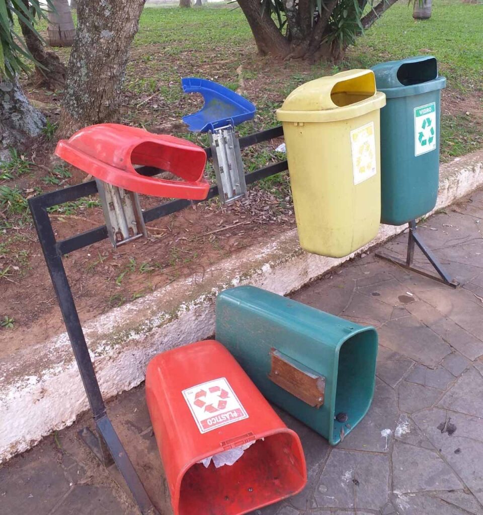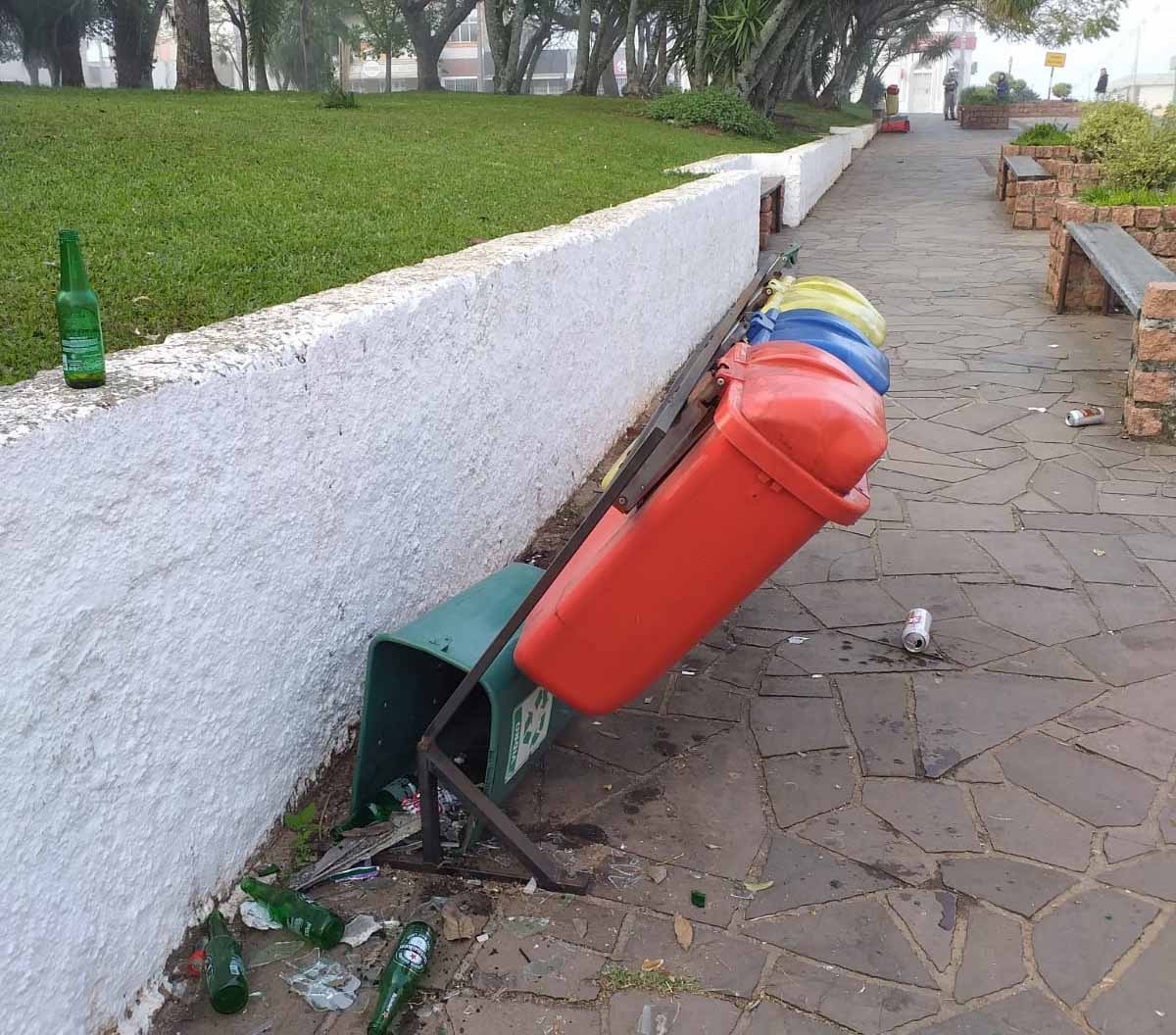 Ao todo foram danificadas oito lixeiras e suportes. Foram tomadas medidas cabíveis e efetuado o registro.