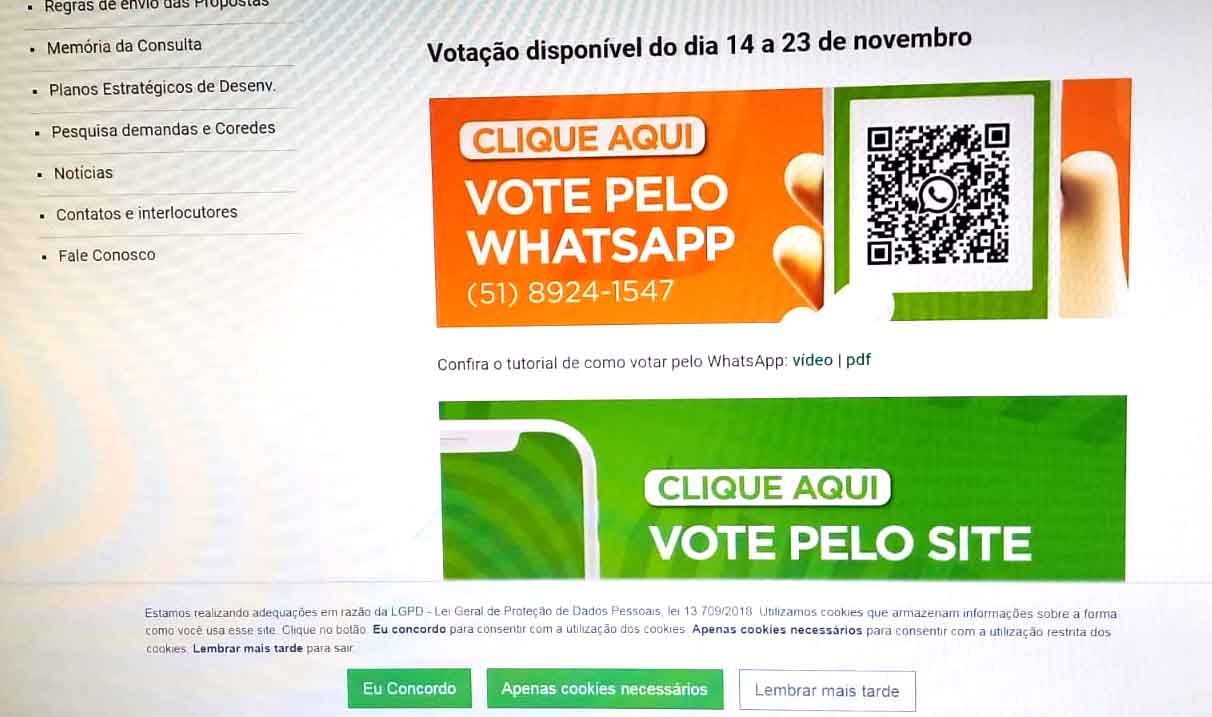 Com a baixa adesão dos eleitores no processo de votação, o prazo para a população votar na Consulta Popular de 2022 foi prorrogado até a próxima quarta-feira, 30 de novembro. O processo, que teve início no dia 14 de novembro, está sendo realizado via aplicativo Colab, por meio do site www.consultapopular.rs.gov.br e no Whatsapp (51) 8924-1547 (sem inclusão do 9 na frente do número).